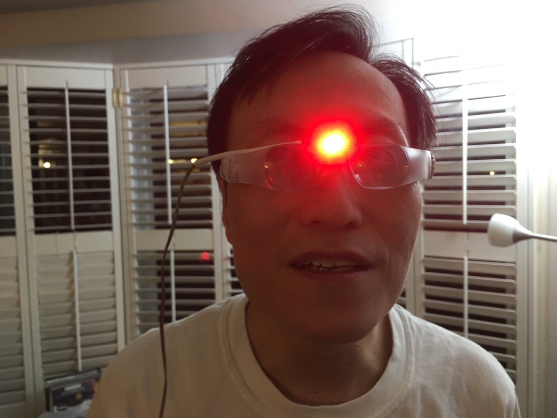 The device is essentially a hands-free red LED light to fit on Dr. Stein’s glasses; his patients are supposed to keep their eye on the red light so that the pupil remains centered as he marks their sclera to prepare for an intraocular lens implant. Basically, it enables more accuracy during sugery.